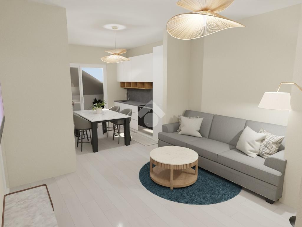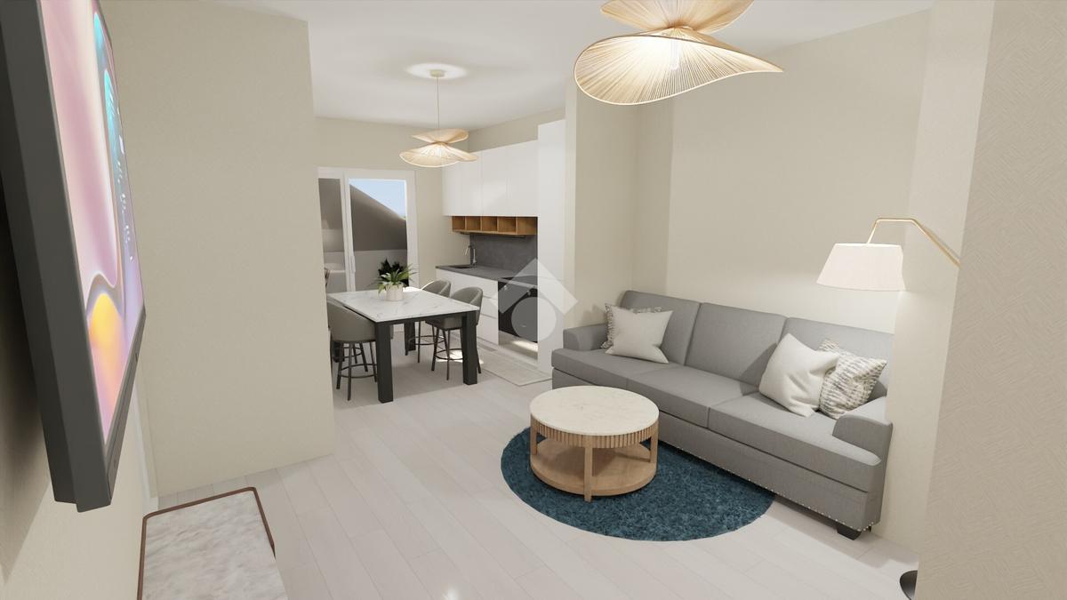 Soggiorno con angolo cottura, due camere da letto, un bagno, terrazza abitabile.