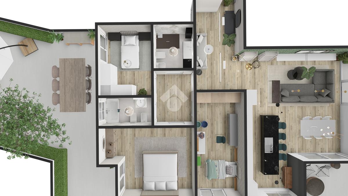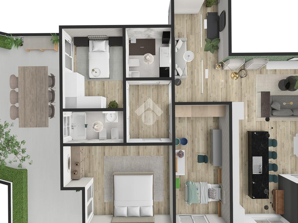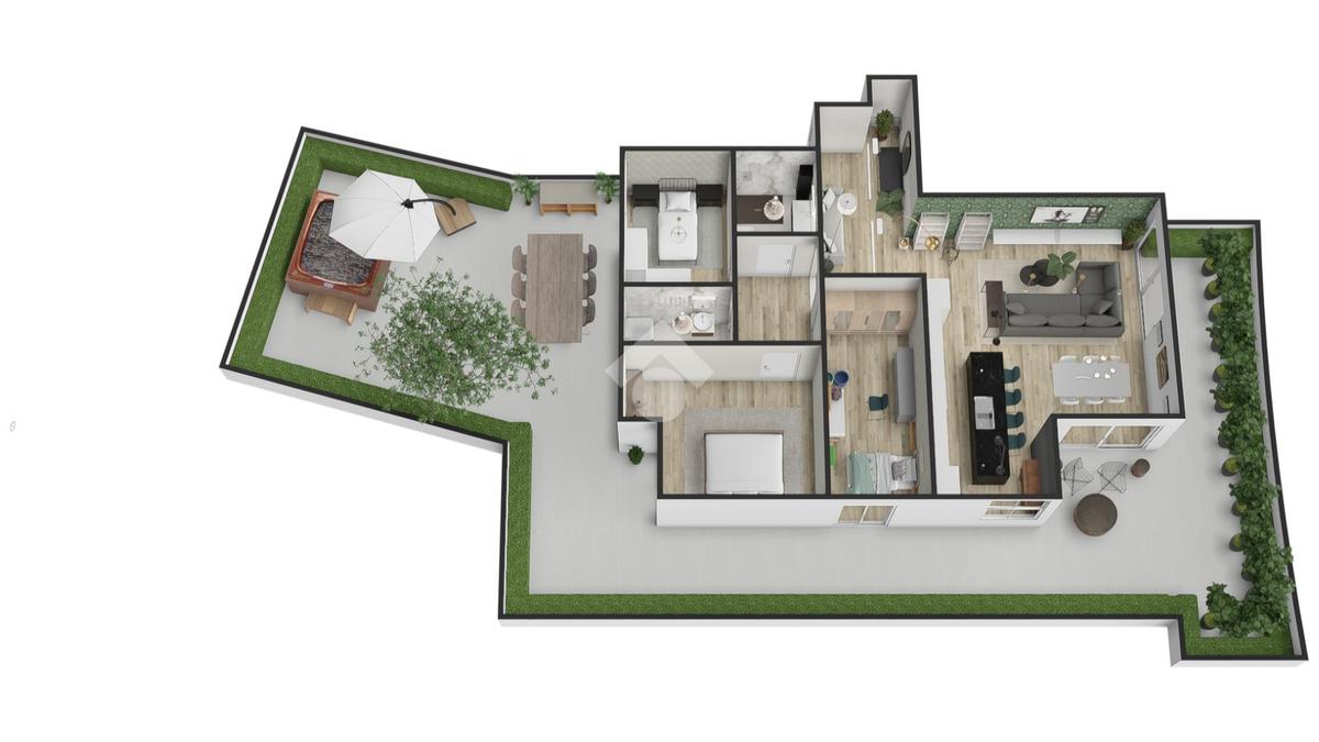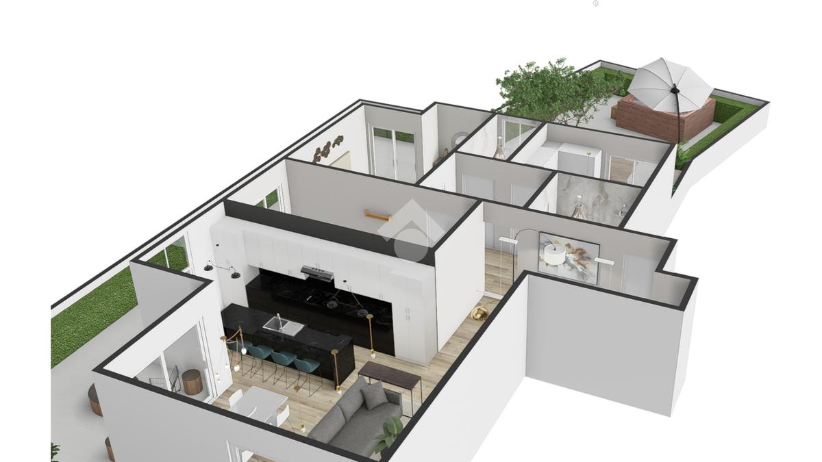 Il layout dell'attico offre numerose soluzioni personalizzabili: per chi predilige gli open space, la cucina può essere unita alla zona living, creando un ambiente perfetto per ricevimenti o cene con amici. Chi invece preferisce una maggiore separazione degli spazi, può optare per una cucina abitabile e un soggiorno più intimo, grazie alla disposizione intelligente delle superfici.