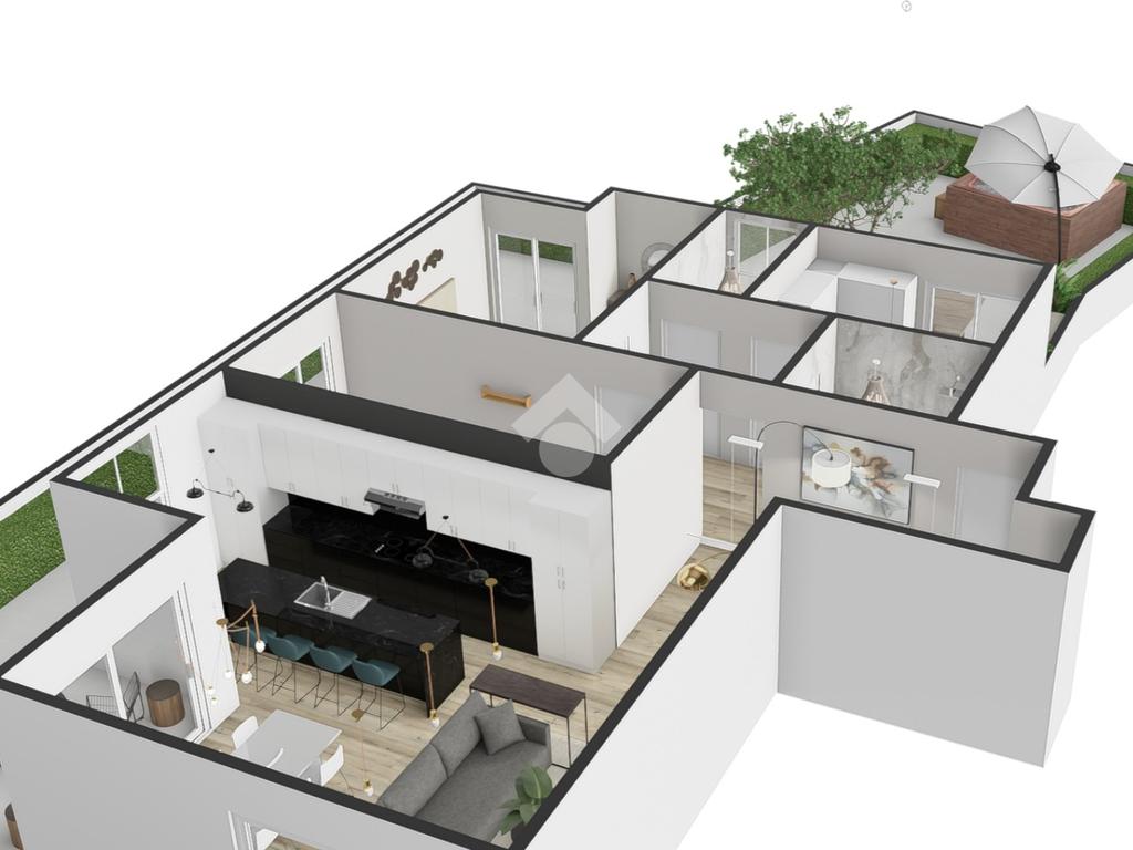 Appena varcata la soglia, ci si trova in un elegante disimpegno che introduce al cuore della casa: un ampio soggiorno open space, ideale per chi ama gli ambienti luminosi e ariosi. Questo spazio è caratterizzato da due aree distinte ma ben integrate. Le ampie vetrate incorniciano la zona giorno, donando continuità con l'esterno e offrendo viste spettacolari sul grande terrazzo.