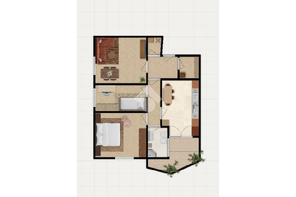 Questa soluzione è pensata per una giovane coppia alla ricerca del primo acquisto: spazi funzionali, ambienti già pronti da vivere, terrazzo per godere di momenti all'aperto e posizione strategica che permette di muoversi anche senza auto.