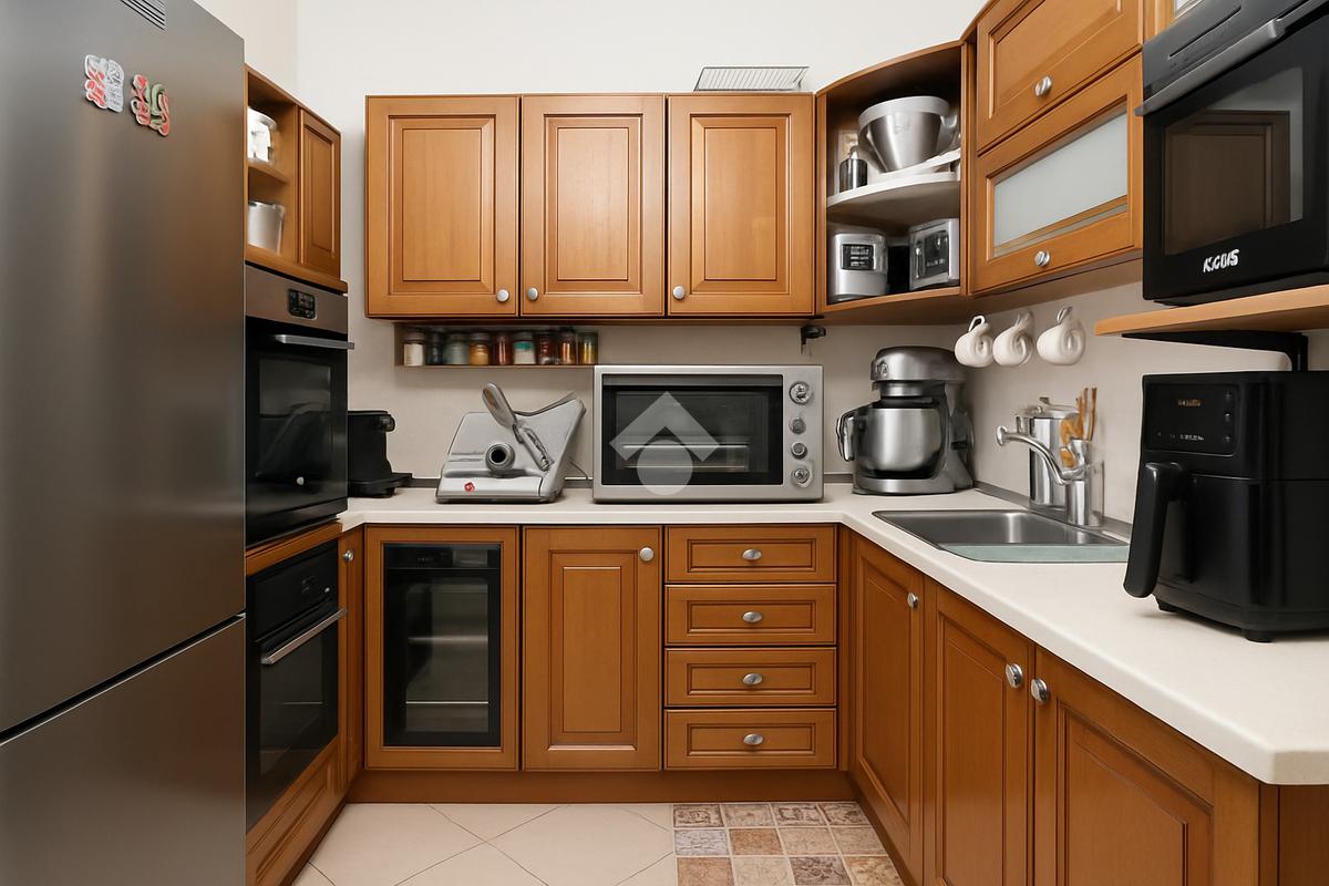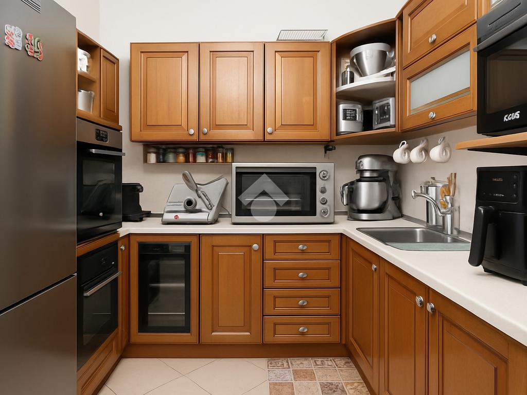 La cucina è separata e ha una forma razionale che permette di organizzare tutto ciò che serve, mantenendo ordine e praticità anche nelle giornate più intense.