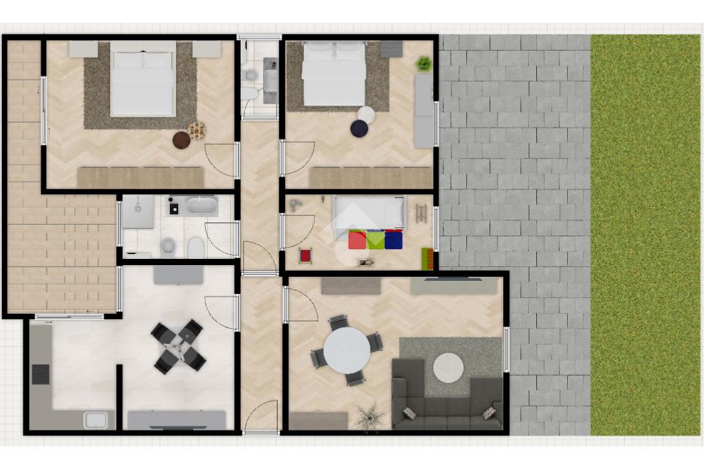 Varcata la porta d’ingresso si entra subito in uno spazio ampio e luminoso, che si apre verso il giardino privato, facilmente accessibile e ideale per vivere all’aperto ogni giorno, tra pranzi, momenti di relax e giornate in compagnia. La cucina, separata ma vicina alla zona living, è organizzata in modo funzionale con area cottura e zona pranzo, e comunica con un terrazzo verandato perfetto come lavanderia e spazio di servizio.