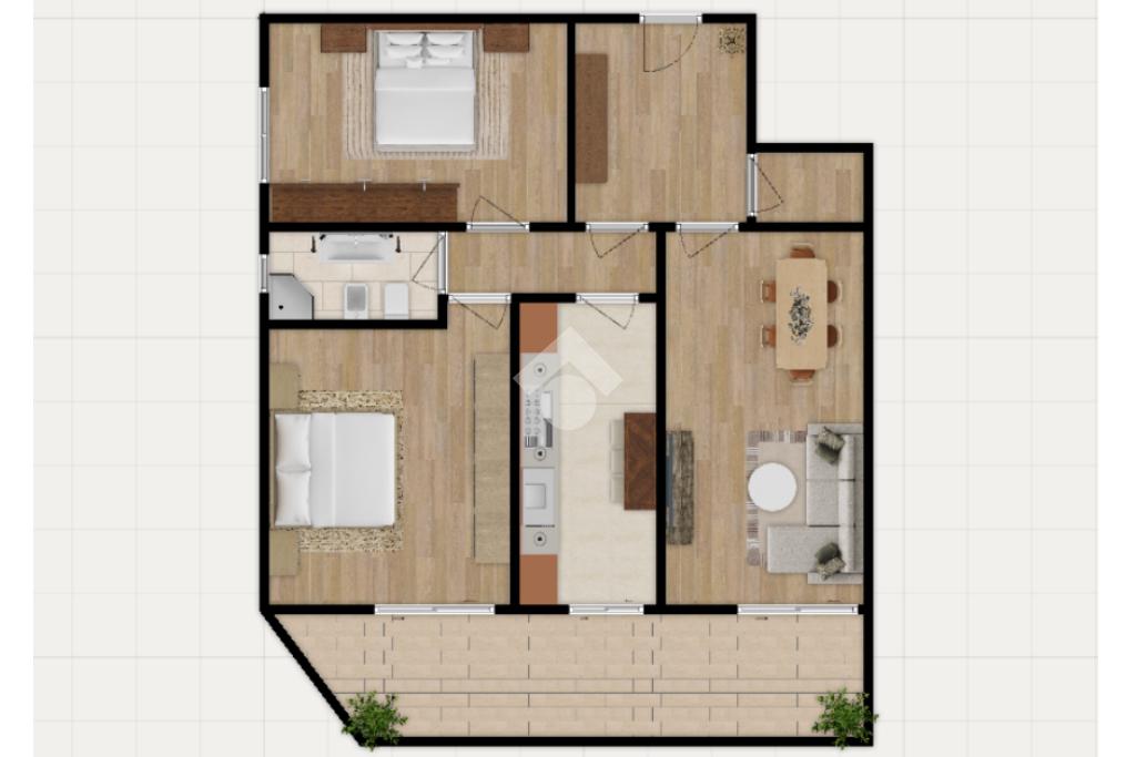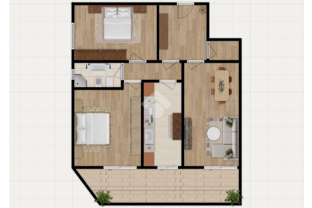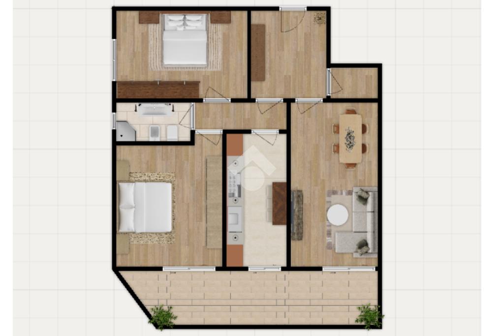 Entrando in casa, l’ampio ingresso accompagna verso gli ambienti principali, offrendo subito una sensazione di ordine e buona distribuzione. La sala, dalle dimensioni generose, è uno spazio accogliente e versatile, facilmente arredabile e collegato al terrazzo profondo, ideale per pranzi all’aperto o momenti di pausa durante la giornata. Accanto, la cucina abitabile mantiene una sua autonomia, risultando pratica e funzionale per la vita quotidiana.