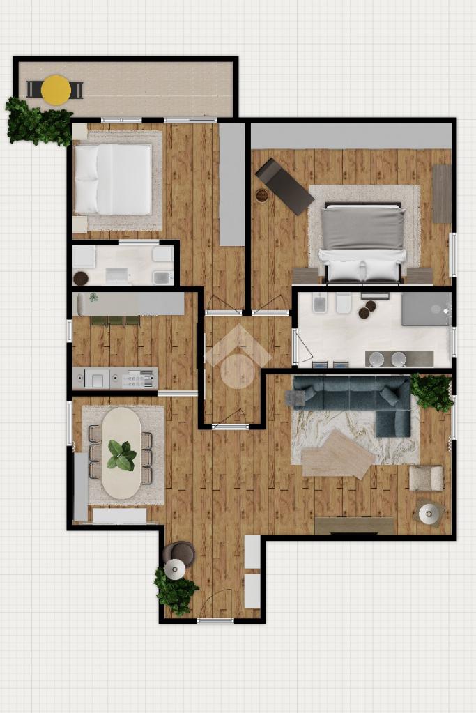 L’ingresso si apre su un salone accogliente e contemporaneo con soggiorno doppio. Gli spazi sono ben distribuiti e accompagnano in modo naturale verso la cucina separata e semi abitabile. A servizio dell’abitazione troviamo un pratico ripostiglio e un terrazzo, perfetto per ritagliarsi uno spazio all’aperto in ogni momento della giornata.